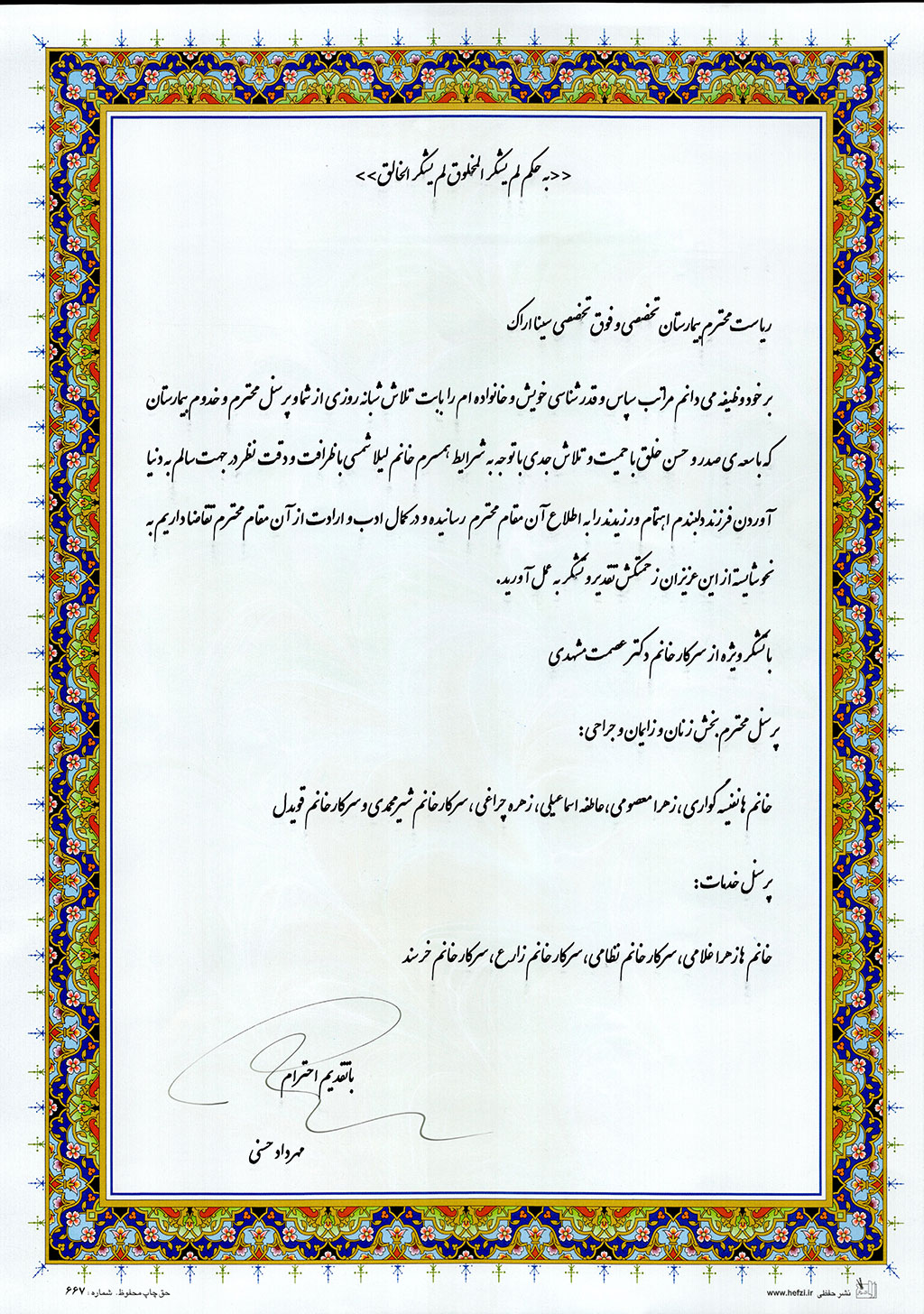 تقدير و تشكر يكي از بيماران از خدمات دريافت شده در بيمارستان فوق تخصصي سينا